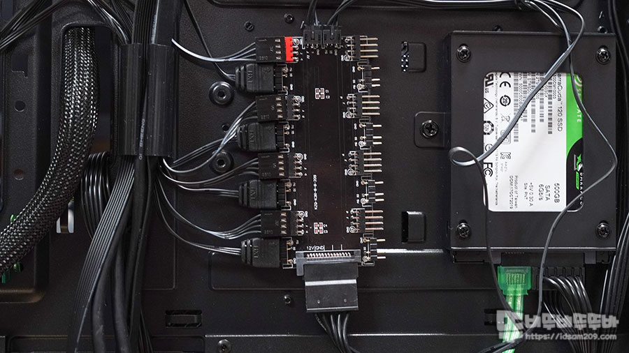 샤시 뒤쪽에 부착된 ARGB 팬 컨트롤러 모습.