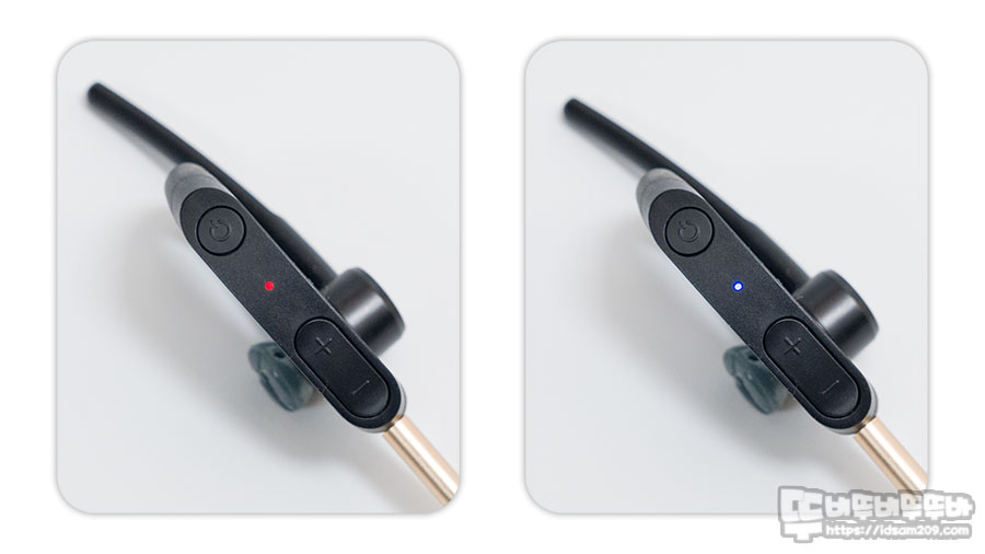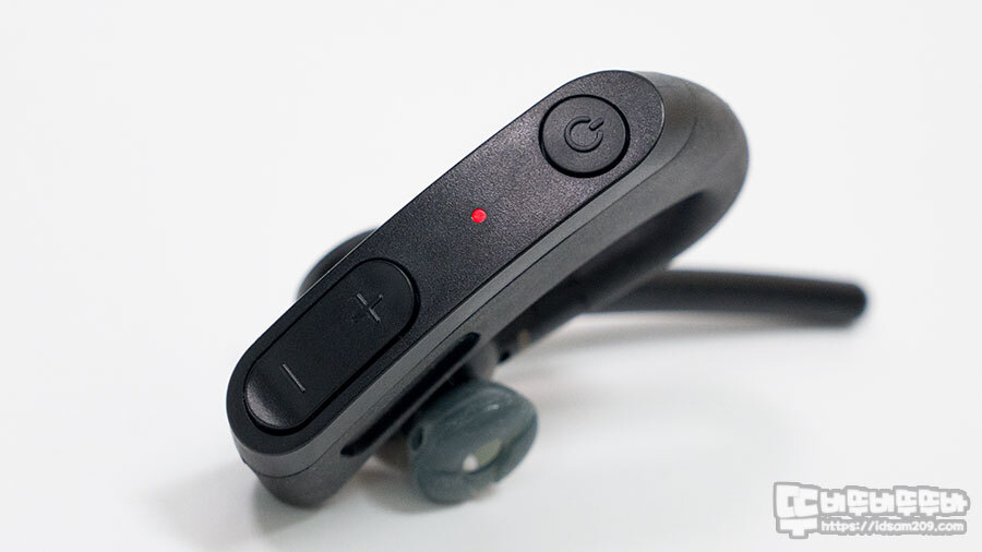 메인 컨트롤러가 내장된 컨트롤 부는 상단에 전원 On/Off와 전화 수신/ 전화 끊기를 지원하는 멀티 펑션 버튼과 제품의 상태를 표현하는 LED 인디케이터, 볼륨을 조절과 음성 어시스턴트 또는 재다이얼 기능을 하는 +/- 버튼으로 구성되어 블루투스 기기에서 흔히 볼 수 있는 3 버튼 컨트롤 구성임을 확인할 수 있습니다.