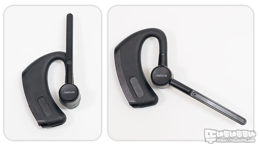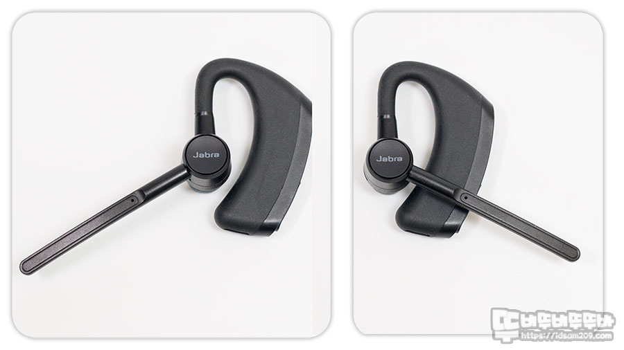 약 120도 회전이 가능한 붐 마이크가 달린 이어버드는 180도 회전이 가능하여 좌/우 구분 없이 편안하게 사용이 가능하며 어느 쪽으로 착용하더라도 사용하는데 불편함은 없는 편입니다.