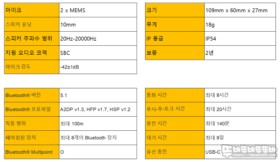 제품 스펙을 살펴보면 듀얼로 구성된 모듈 형태의 MEMS 마이크로 노이즈 캔슬링 구현, 블루투스 5.1, SBC 코덱, 연속통화 최대 8시간, 보증기간 2년으로 유사 디자인 제품군 중에서는 보증기간 제법 긴 편이네요.