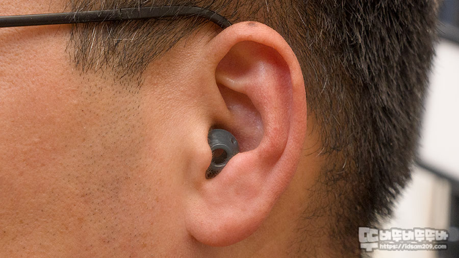 앞부분에 설명드린 겔타입 이어팁의 착용 방식입니다. 위의 사진과 같이 이어팁이 귓구멍 앞쪽에 끼워주는 형태로 착용하기에 연골을 부분을 누르는 압이 느껴지지 않아 편안하게 착용할 수 있고요.