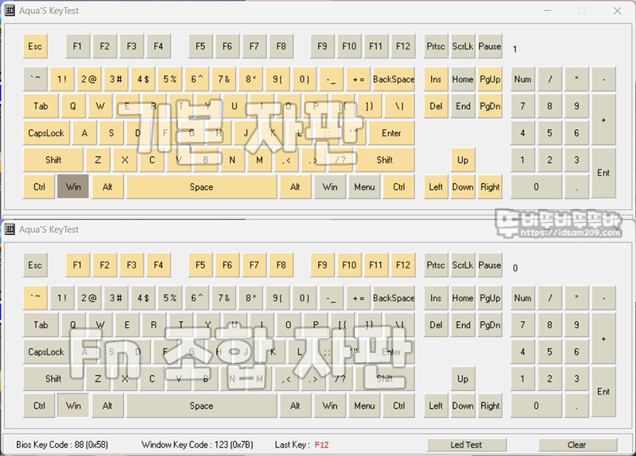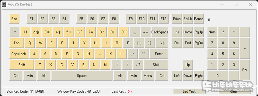 위의 키보드 입력 테스트 프로그램에서 보이는 것과 같이 Home, End 키 그리고 Print Screen, Scroll Lock, Pause 키를 지원하지 않아 텐키리스 키배열 사용은 불가능하고요.