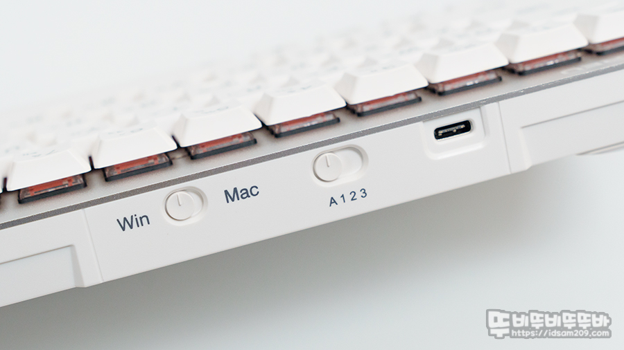 키보드 상단 부분에는 USB-C 충전 단자와 유선(A)과 무선 멀티 페어링 표현하는 (1/2/3) 셀렉트 스위치 그리고 WIndow & Mac 운영체제 선택 스위치로 구성되어 있으며 Fn 조합으로 선택하는 기능에 비해 직관적이긴 하지만 셀렉트 스위치를 조작해야 하는 번거로움이 있는 만큼 버튼 조합방식과 스위치 방식의 차이를 이해하시고 사용하시는 게 좋을 거 같습니다.