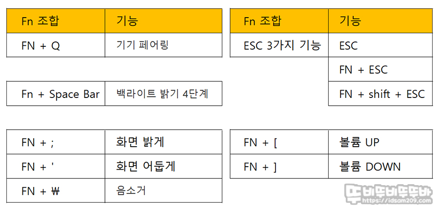 먼저 기본 자판 정보와 Fn 키 조합으로 사용 가능한 키보드 기능을 확인해 보았습니다.