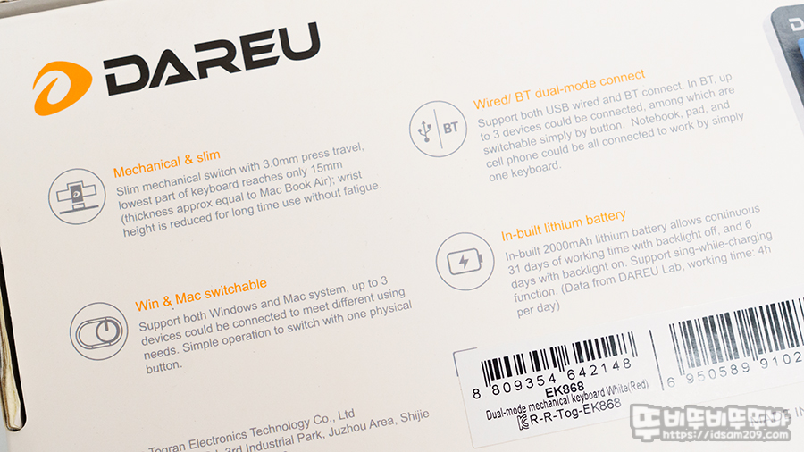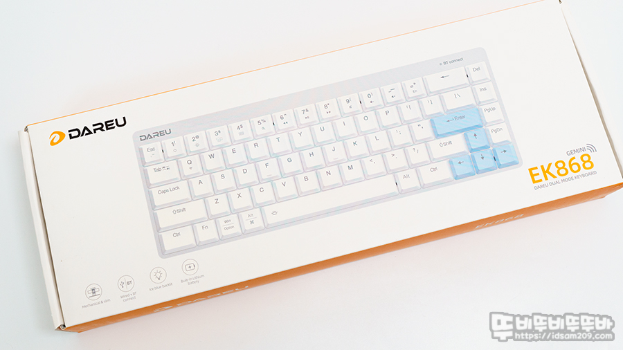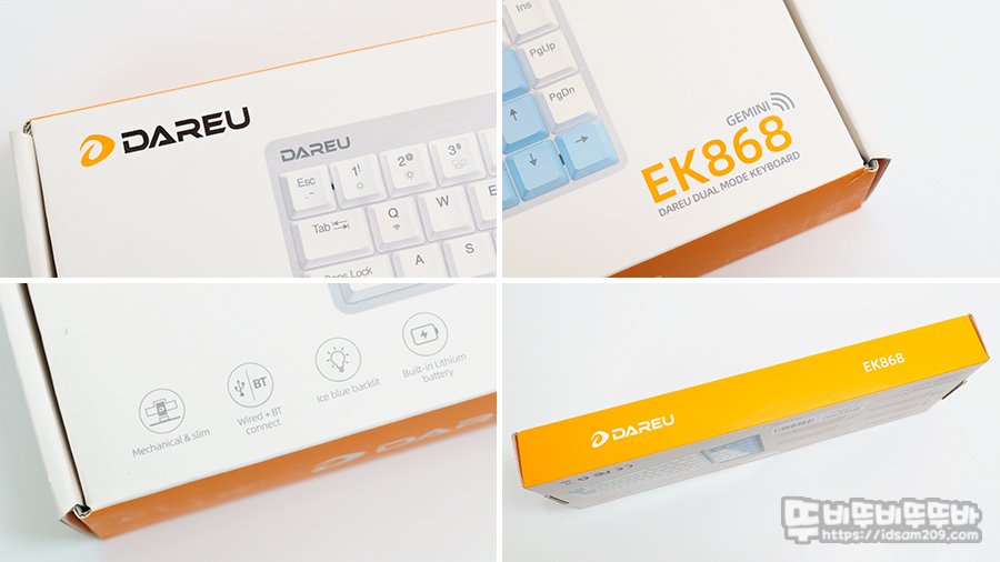 다얼유 EK868 블루투스 유무선 로우 프로파일 LP 슬림 기계식 키보드 패키지는 제품의 이미지와 특징을 잘 표현하고 있는데요.