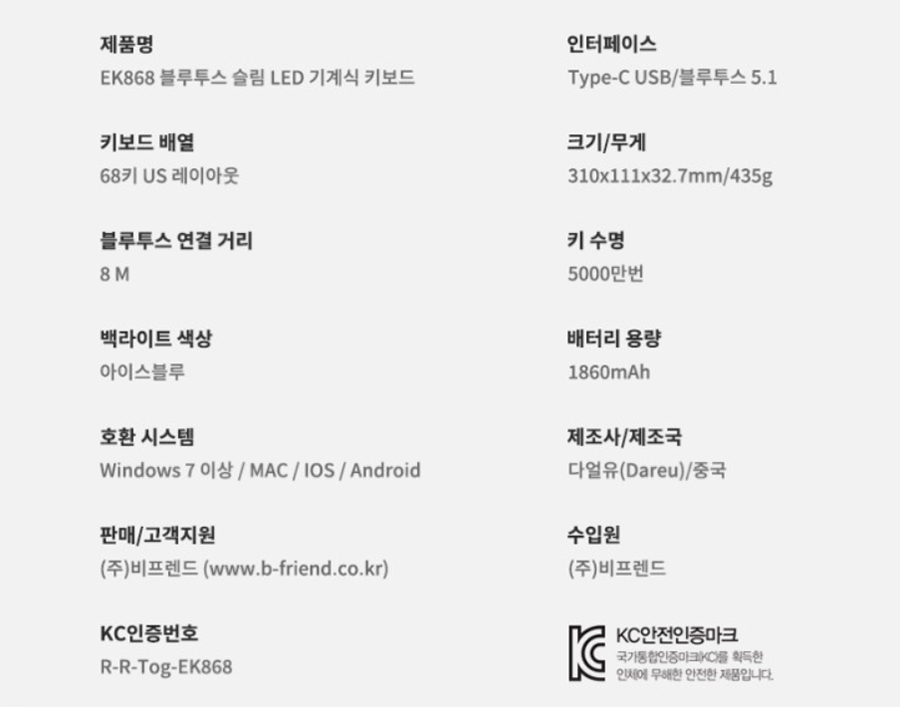 블루투스 5.1 / 68 키 레이아웃 / 카일사 LP 스위치 / 5천만 회 수명 / 블루투스 멀티 페어링 (3대) / 윈도우 & Mac 지원 / 1860mAh 배터리 내장 등의 정보를 확인할 수 있습니다.