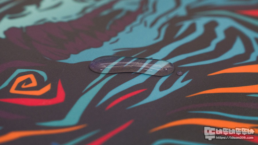 패드에 물을 떨어뜨려보면 동그랗게 물이 뭉쳐있는 것을 확인할 수 있는데 대부분의 발수 기능은 마우스를 오랫동안 사용하다 보면 어느 시점에 살아지게 되니 참고하시기 바랍니다.