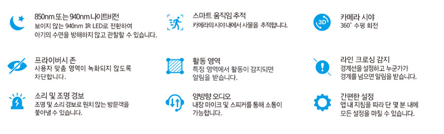 촬영 영역을 설하는 활동 영역 기능, 임의 선을 정해 놓고 선을 넘으면 알려주면 경계 설정, 움직임 감지 그리고 AI 감지 기능에서는 사람, 반려동물, 차량과 같은 사물 이외에 아기, 반려동물, 파손 등 소리까지 감지 등 단순히 화면만 찍는 CCTV가 아니라 사물, 움직임, 소리까지 감지하는 기능을 제공합니다.