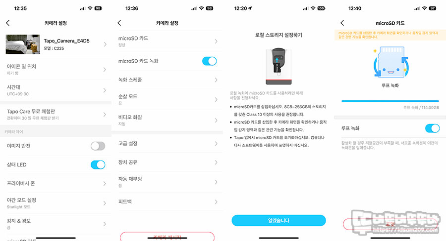 설정 메뉴에서는 이미지 반전, 프라이버시 존 선택, 야간 모드 설정 (나이트 비전 거리 멀리/가까이 선택), 감지 & 경보, MicroSD 메모리 설정, 녹화 스케줄, 순찰 모드, 비디오 화질, 장치 공유(TP-Link ID 계정 필요) 등의 설정을 확인할 수 있는데 MicroSD 메모리는 256GB 용량까지 사용이 가능한 게 특징입니다.