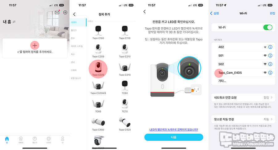 앱스토어에서 "Tapo"를 선택하여 다운받은 후 앱을 실행하여 " + " 눌러 Tapo C225를 선택하여 설치를 진행하게 되는데 대략적인 순서는 이렇습니다.