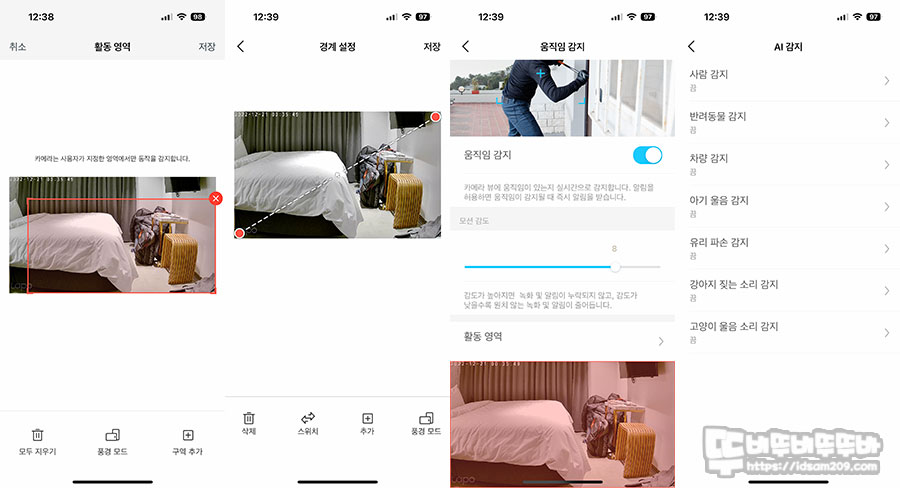 촬영 영역을 설하는 활동 영역 기능, 임의 선을 정해 놓고 선을 넘으면 알려주면 경계 설정, 움직임 감지 그리고 AI 감지 기능에서는 사람, 반려동물, 차량과 같은 사물 이외에 아기, 반려동물, 파손 등 소리까지 감지 등 단순히 화면만 찍는 CCTV가 아니라 사물, 움직임, 소리까지 감지하는 기능을 제공합니다.