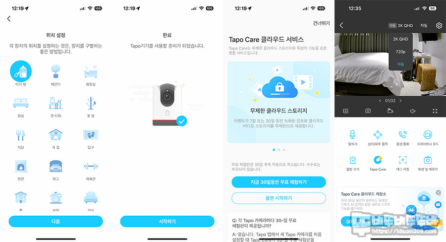 먼저 설정한 카메라의 위치를 정하는 목록에서 해당사항이 있는 내용을 선택하면 작동이 시작되며 처음에 30일간 무료 체험 후 구독 서비스로 전환되는 Tapo Care 클라우드 서비스 안내가 있으니 필요한 부분인지 꼼꼼히 읽어보시고요.