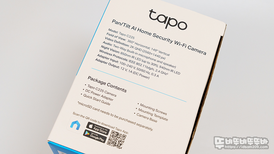 패키지에는 세련되게 디자인된 Tapo C225 모습과 AI 홈 시큐리티 Wi-Fi 카메라라는 설명과 관련된 포인트 기능, 2K(QHD) 해상도, 3년 무상 보증 그리고 글로벌 No.1에 대한 내용을 확인할 수 있습니다.