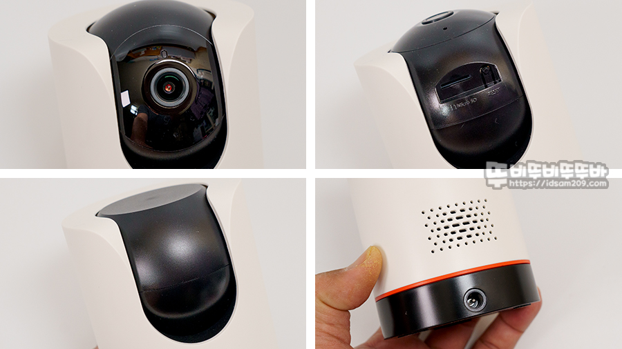 이번 제품의 독특한 점이라면 프라이버시 모드를 지원하여 전면에 버튼을 누르면 원형의 렌즈 부분이 고개를 숙이면서 촬영과 녹음이 안 되는 모드로 전환되어 사생활 보호를 해주기에 안심하고 사용할 수 있습니다.