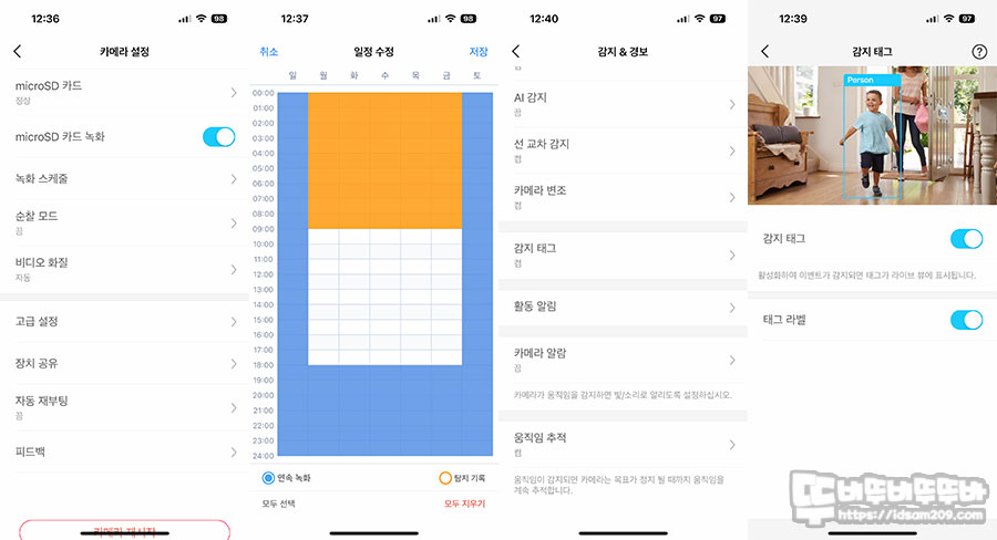 특히 녹화의 편리성에 도움을 주는 녹화 스케줄 기능은 탐지 시 기록하는 기능과 지정된 시간에 녹화하는 기능을 지원하기에 카메라 설치와 요일 그리고 시간에 따라 스케줄을 설정하시는 게 좋고요.