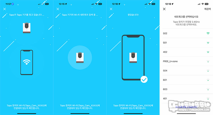 Tapo C225 선택 후 스마트 기기의 Wi-Fi 리스트에 나타나는 " Tapo_Cam_E4D5 "를 선택하여 스마트 기기와 Tapo C225를 Wi-Fi로 기기 연결을 하고 그 이후 Tapo C225와 무선 공유기 AP를 연결하는 과정을 거치되며 연결이 완료되면 앱을 통하여 카메라로 촬영된 내용을 실시간 모니터링이 가능해집니다.
