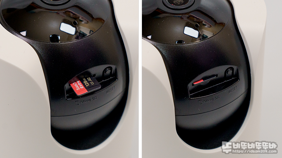 원형 렌즈 부분은 위로 올리면 MicroSD 슬롯과 리셋 버튼을 확인할 수 있는데 메모리는 최대 256GB까지 지원하며 메모리를 사용하지 않는 방식으로는 Tapo Care 클라우드 서비스를 구독하면 클라우드 서비스를 통해 저장과 재생이 가능한데요.