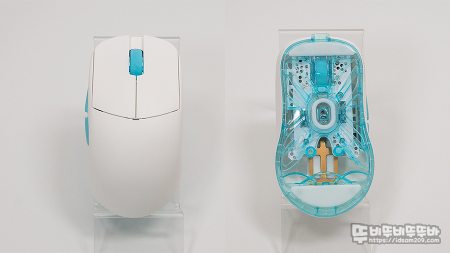 LAMZU(람주) Atlantis Superlight 무선 게이밍 마우스는 대칭형 디자인의 오른손 전용 마우스로 아이스 블루 컬러답게 화이트 하우징과 블루 컬러 버튼 그리고 바닥면에 약간의 타공이 적용된 투명 블루 컬러 플라스틱이 사용되어 시원한 느낌을 줍니다.