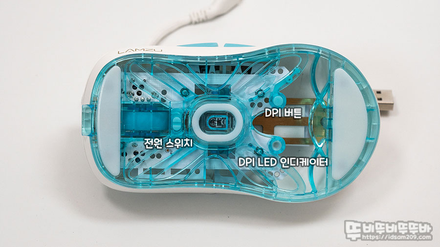 투명 블루 컬러가 적용된 바닥면은 센서 위쪽에 가로로 작동하는 전원 On/Off 스위치 그리고 아래쪽에 좌우 대칭으로 디자인된 DPI LED 인디케이터와 DPI 버튼을 확인할 수 있으며 제품의 무게가 가벼워서 그런지 앞쪽과 뒤쪽에 부착된 PTFE 피트가 면적에 비해 적게 디자인된 느낌입니다.