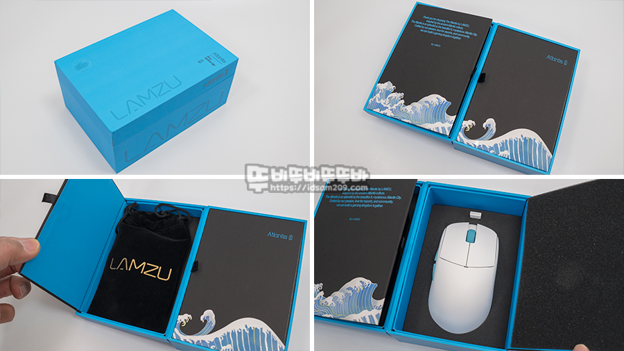 LAMZU(람주) Atlantis Superlight 무선 게이밍 마우스는 이중 패키지로 구성되어 마우스가 인쇄된 커버를 오픈하면 블루 컬러 하드박스로 디자인된 패키지를 마주하게 됩니다.
