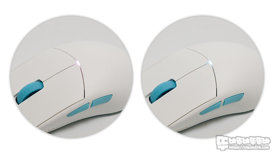 람주 무선 게이밍 마우스는 모션싱크 기능이 탑재된 Pixart PMW3395 센서와 Huano Blue (핑크 버튼) 스위치를 사용하고 있는데요.