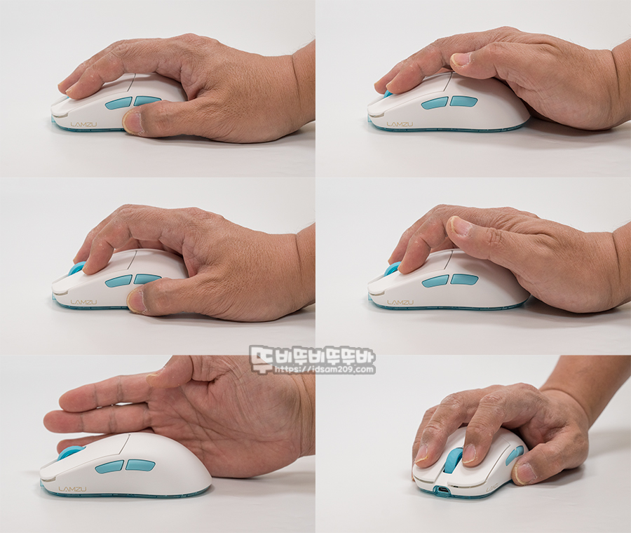 123mm 길이의 람주 무선 게이밍 마우스는 필자가 그립 시 살짝 작은 느낌으로 첫 번째 팜그립보다 두 번째 클로우 그립이 적합해 보이며 손이 큰 사람이라면 핑거 그립도 잘 맞을 수 있을 거 같습니다.