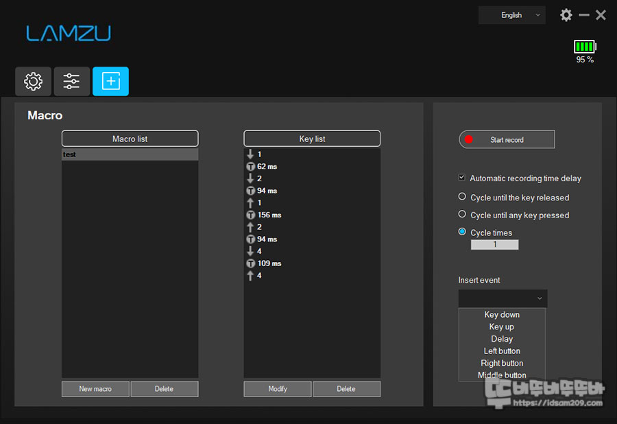 필요에 따라 insert event 메뉴를 활용하시거나 Key list를 마우스 오른쪽 버튼을 이용하여 수정/삭제가 가능하여 사용자가 원하는 매크로 기능이 편집할 수 있습니다.