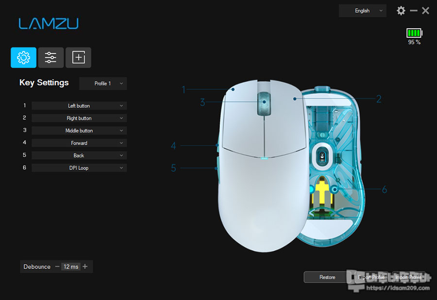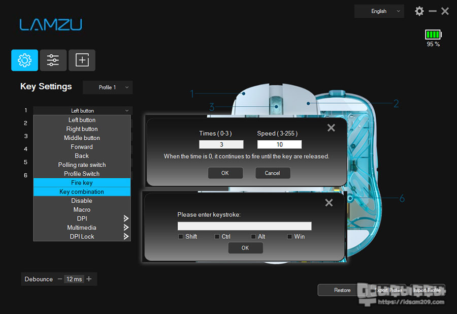 프로그램 왼쪽 하단에는 디바운스 타입 설정이 가능한데 기본값 12ms, 최저 0ms, 최대 30ms로 설정이 가능하고요.
