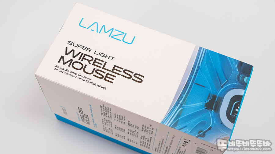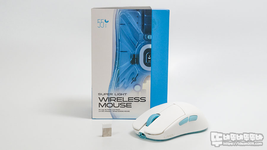 패키지에는 제품의 무게인 55g을 강조하고 있으며 모델명과 2.4GHz RF 무선 방식의 저지연, 저전력을 강조하며 무선 또는 유선 사용이 가능한 게이밍 마우스입니다.