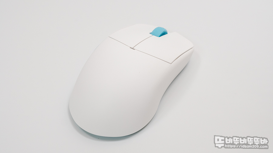 LAMZU(람주) Atlantis Superlight 무선 게이밍 마우스는 대칭형 디자인의 오른손 전용 마우스로 아이스 블루 컬러답게 화이트 하우징과 블루 컬러 버튼 그리고 바닥면에 약간의 타공이 적용된 투명 블루 컬러 플라스틱이 사용되어 시원한 느낌을 줍니다.