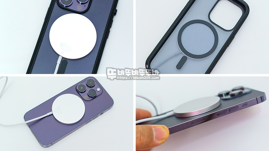 아이폰 14 Pro + 맥세이프 지원 케이스 + 맥세이프 무선 충전기를 사용한다면 안정감 있게 자력으로 잘 부착된 상태에서 충전이 가능합니다.