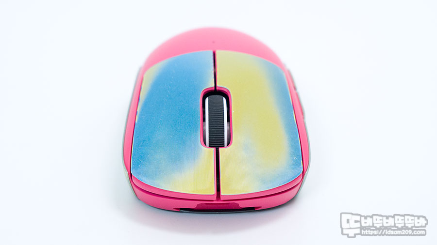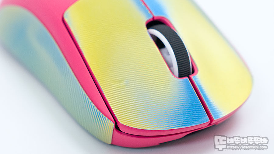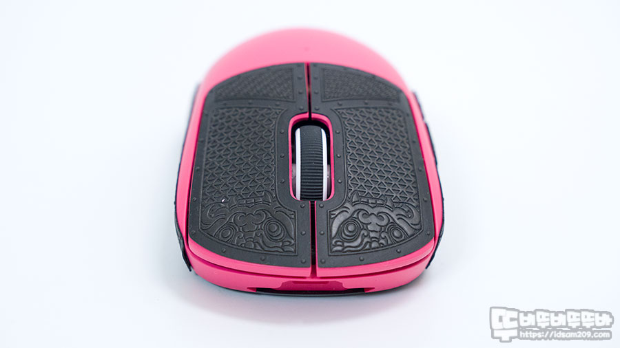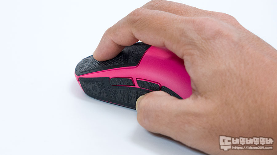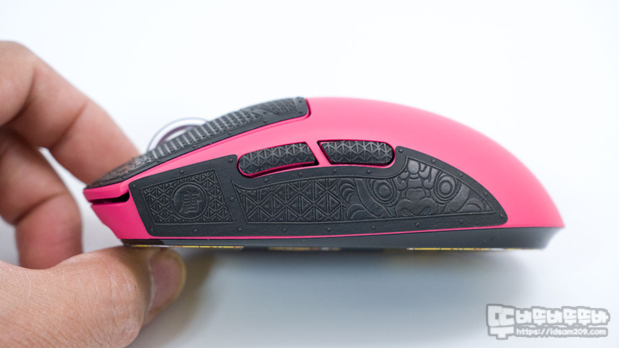 앞서 설명드린 대로 검지와 엄지손가락 위치에 그립패치 삼각형 패턴 디자인이 다르게 적용되어 안정적인 마우스 그립을 지원하며 그립 패치의 두께감이 없어 마우스 하우징 느낌을 선호하시는 분들이 사용하시면 좋을 거 같아요.