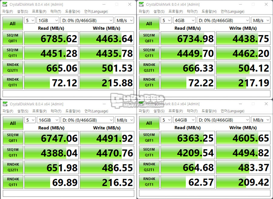 CrystalDiskMark 테스트에서는 테스트 용량을 1/4/16/64 순으로 변경하여 테스트 시 테스트 결과가 제품의 스펙인 순차읽기: 6,600MB/s / 순차쓰기: 4,000MB/s 속도를 상회하거나 약간의 편차를 보여주고 있습니다.