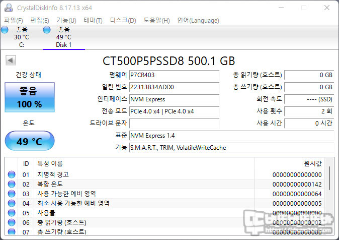 CrystalDiskInfo에서는 마이크론 Crucial P5 Plus가 PCIe 4.0 x4를 지원하는 제품 그리고 S.M.A.R.T 및 Trim 기능을 지원하는 것을 확인할 수 있습니다.