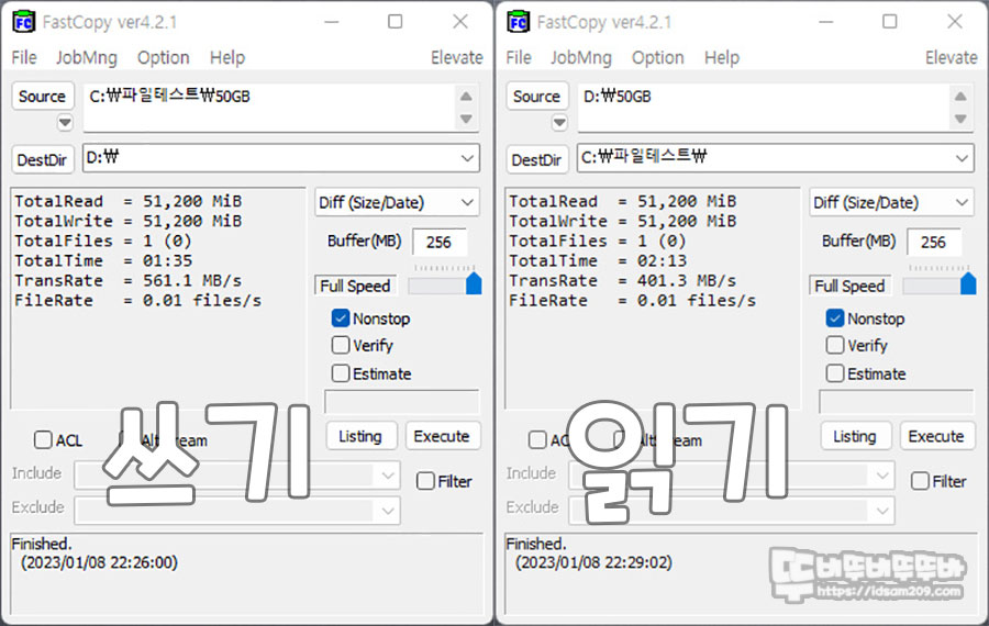 SATA 방식의 SSD와 M.2 방식의 SSD의 서로 다른 제품 간에 데이터 복사 테스트이기에 사용환경에 따라 차이가 있을 수 있으니 참고하시기 바랍니다.