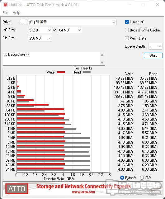 ATTO Disk 벤치에서도 스펙 정보가 비슷한 결과를 확인할 수 있었습니다.