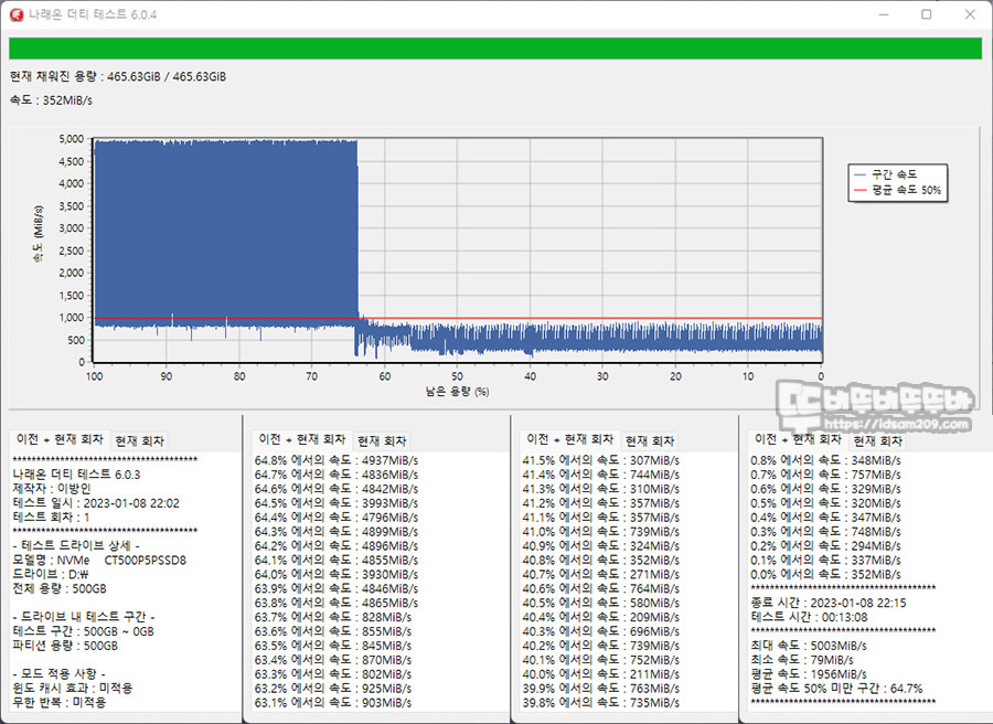 나래온 더티 테스트에서는 캐시 적용 구간 쓰기 속도가 최대 4,971MB/s, 평균 속도는 1,836MB/s을 보여주며 평균 속도 50% 미만 구산 64.7% 성능을 보여주네요.