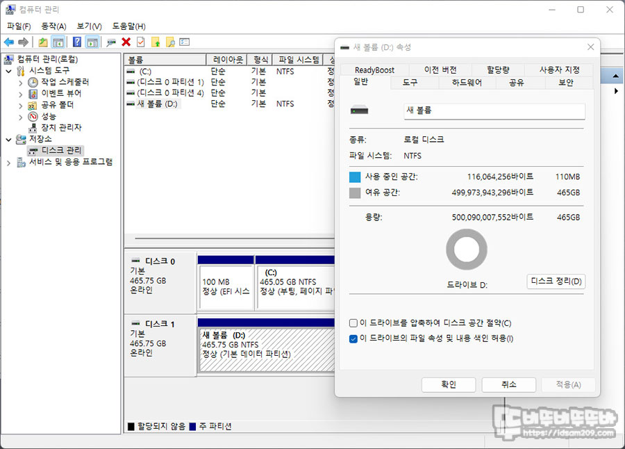 시스템 부팅 후 제어판 - 시스템 및 보안 - 관리 도구 - 컴퓨터 관리 메뉴에서 활성화되지 않은 마이크론 Crucial P5 Plus를 사용할 수 있게 활성화 후 볼륨 생성과 포맷 과정을 거쳐 D 드라이버로 선택하였습니다.