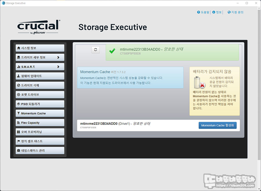 Crucial Storage Executive에서는 디스크의 사용량 컨디션, 펌웨어 업데이트, 포맷과 삭제 등이 가능하며 시스템 메모리의 일부를 캐시로 사용하는 모멘텀 캐시를 지원하는데요.