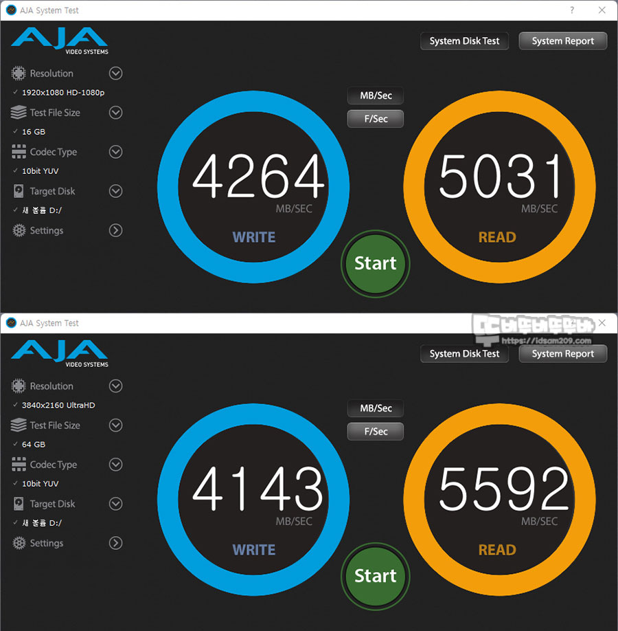 AJA 비디오 인코딩 테스트 프로그램으로 Full HD 해상도 16GB, 4K 해상도 64GB 용량을 인코딩 테스트 시 쓰기 속도는 제품 스펙의 성능과 비슷하게 나오지만 읽기 속도는 조금 차이가 나는 편이네요.
