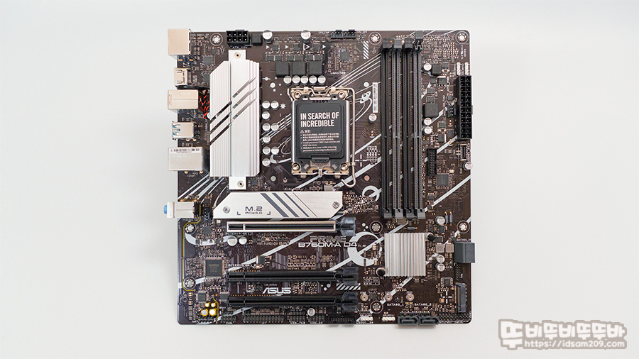ASUS PRIME B760M-A D4 STCOM 메인보드 M-ATX 폼펙트인 PRIME B760M-A D4 메인보드는 PRIME 라인업답게 전원부 히트싱크, M.2 SSD 히트싱크, 칩셋 히트싱크 모두 실버 컬러로 통일한 게 특징입니다.