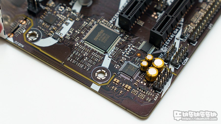 마지막으로 메인보드 하단 쪽에 전면 HD_AUDIO 포트, USB 2.0 포트 2개, 전면 USB 3.0 포트, +12V RGB 헤더, Addressable RGB +5V 3핀 헤더 1개 그리고 전면 I/O 커넥터 모습을 확인할 수 있습니다.