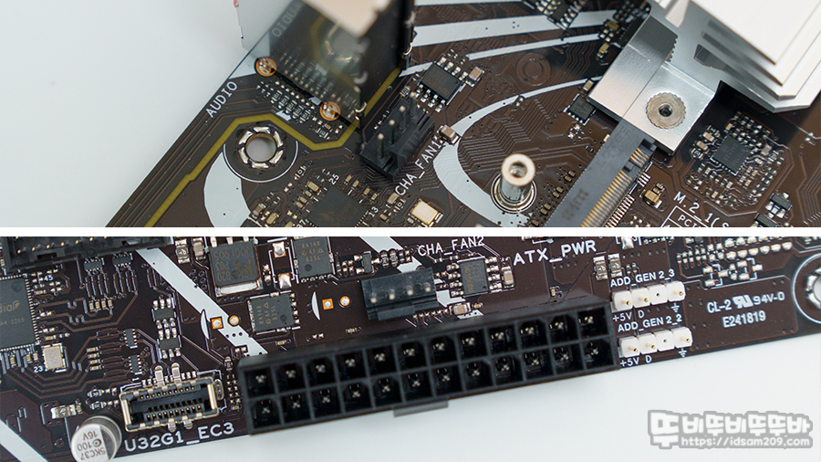 사운드카드 뒤쪽에 위치한 CHA_FAN1 커넥터, 그리고 24핀 커넥터 뒤쪽에 위치한 CHA_FAN2 커넥터 그리고 전면 USB Type-C 소켓 모습.