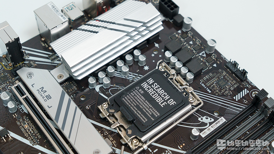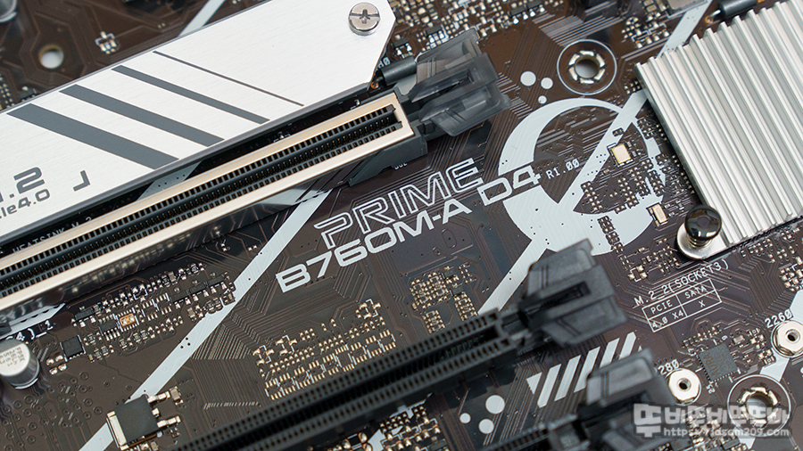 ASUS PRIME B760M-A D4 STCOM 메인보드 M-ATX 폼펙트인 PRIME B760M-A D4 메인보드는 PRIME 라인업답게 전원부 히트싱크, M.2 SSD 히트싱크, 칩셋 히트싱크 모두 실버 컬러로 통일한 게 특징입니다.