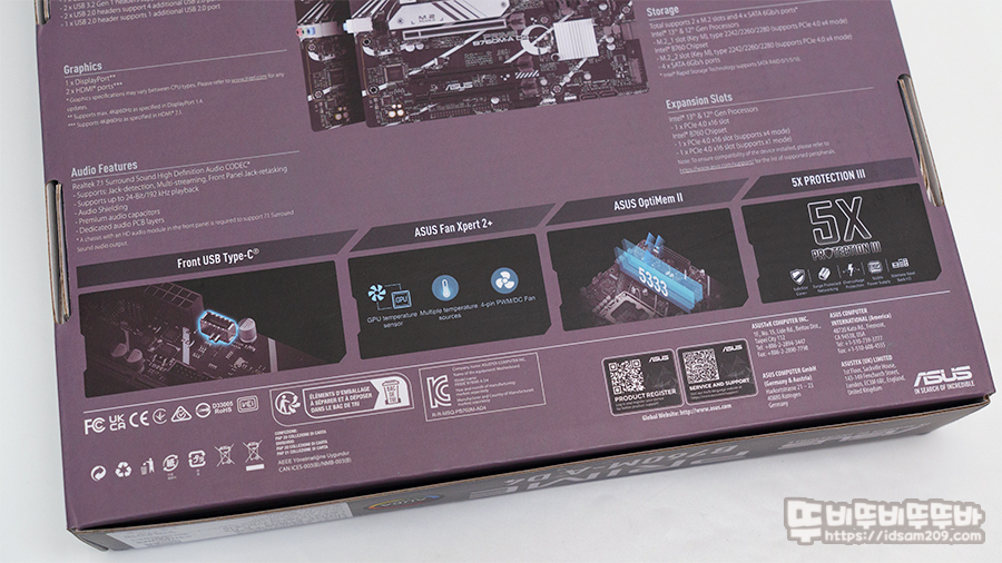 그밖에 전면 USB Typc-C 포트, ASUS Fan Xpert 2+ 제어 소프트웨어 지원, ASUS 고유 메모리 OC 기술인 OptiMem II 기술, ASUS의 시스템 보호 기술로 검증된 기술인 5X Protection III가 적용 등도 인쇄되어 있습니다.