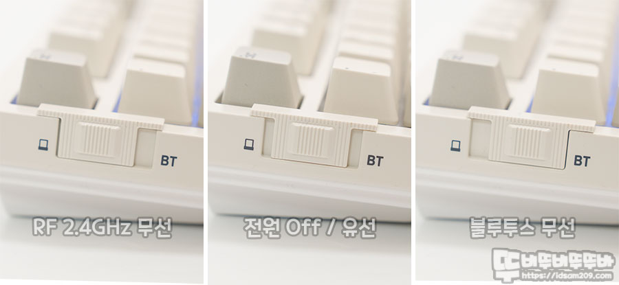 다얼유 A87PRO 레트로베이지는 키보드 오른쪽에 RF 무선 리시버가 수납되어 있으며 왼쪽은 RF무선/유선/블루투스 무선을 선택할 수 있어 빠른 선택이 가능한 장점이 있는데요.