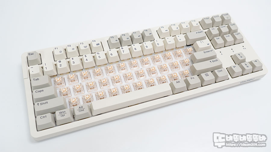 다얼유 A87PRO 레트로베이지 염료승화 키캡 & 저소음 택타일 스위치는 색 바랜 느낌의 베이지 컬러 베이스에 회색컬러가 가미된 투톤 느낌으로 레트로 분위기를 자아내며 PBT 키캡에 이중사출로 표현되는 깔끔한 각인이 정갈한 느낌을 줍니다.