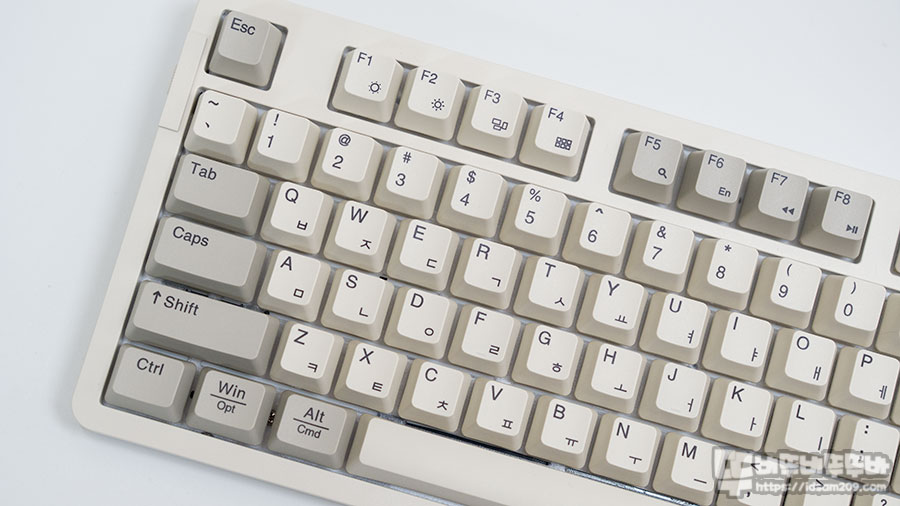 PBT 이중 사출 키캡의 각인 상당히 깔끔하고 퀄리티가 좋은 편인데요. 사진 촬영 시 플래시를 사용해서 밝게 나온 편이지만 실제로는 살짝 노르스름하니 참고하시기 바랍니다.