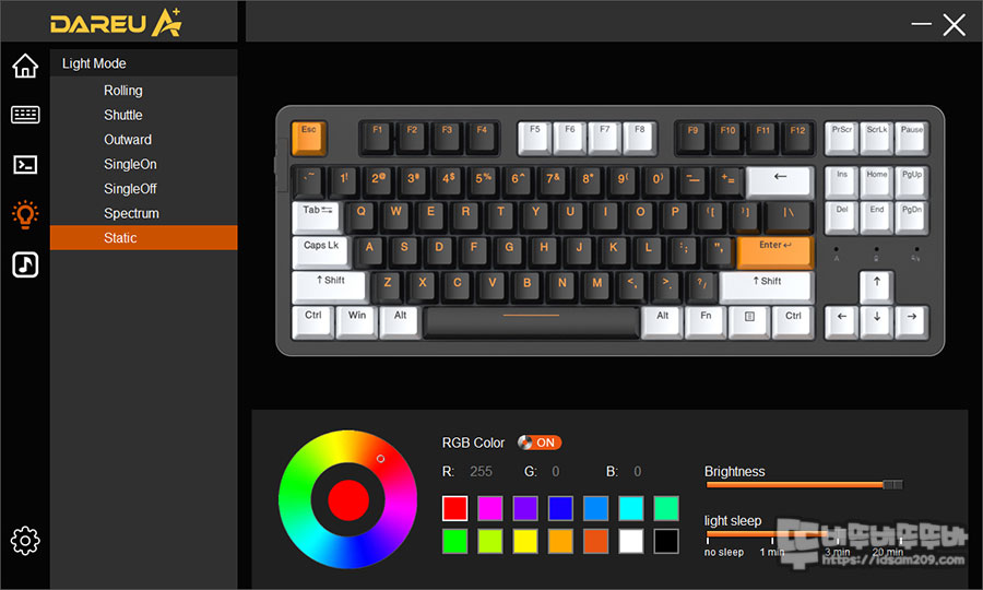 RGB 효과 6가지 그리고 RGB 컬러가 고정되어 표현되는 Static 효과에서 RGB Color On/Off를 통해 RGB 또는 단색 컬러로 RGB LED 효과를 표현하며 Fn + [ 과 Fn + ] 기능을 이용한 표현과 동일하게 표현되는 만큼 사용자가 편리한 쪽을 활용하시기 바랍니다.