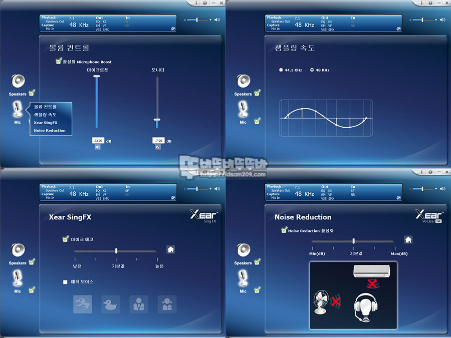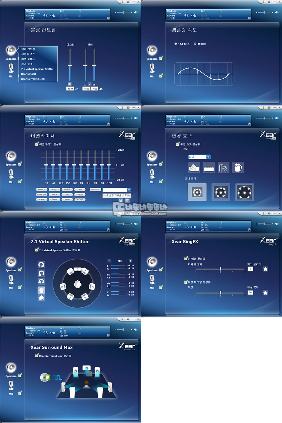소프트웨어는 C-Media 레퍼런스 디자인의 모습으로 아마도 CM108B 칩셋을 사용한 걸로 보이며 가상 7.1 채널을 사용하기 위해서는 7.1 Virtual Speaker Shifter 활성화 Xear Surround Max를 활성화하여 같이 사용하는 것을 추천드립니다.